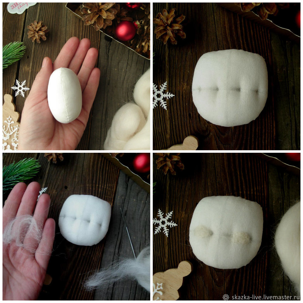 В образовавшиеся впадинки приваливаем глаза – небольшие кусочки шерсти, проверяя их соразмерность – просто проводим по ним подушечками больших пальцев одновременно. Если будет разница –—это сразу почувствуется.