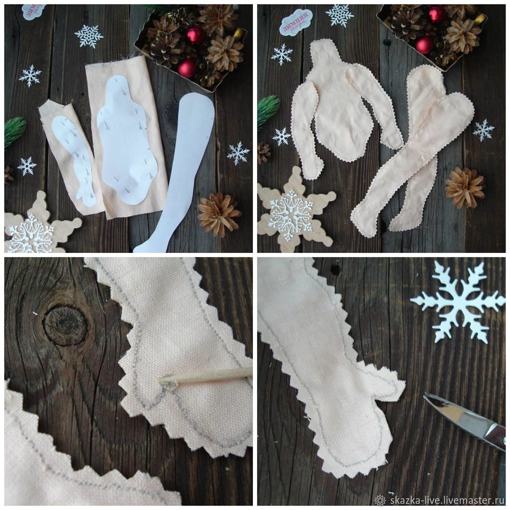 Выкройки прикалываем на сложенную лицевой стороной внутрь ткань и прошиваем самым мелким шагом, максимально скругляя детали, так как любые острые углы будут страшно смотреться при набивке, оставляя места для выворачивания и набивки.