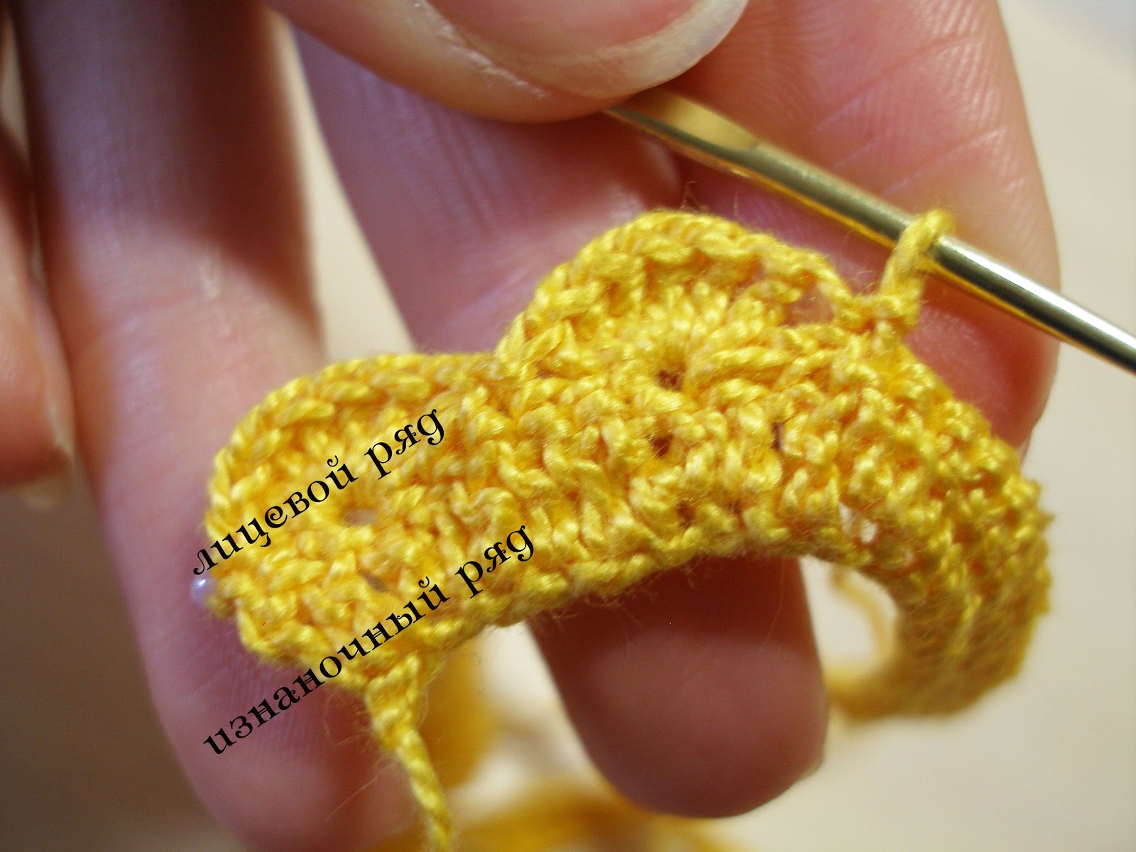 Провязываем второй кустик аналогично первому. Смотрим на фото: Первый ряд для нас изнаночный, а второй - лицевой. НО! Это будет изнанка работы.