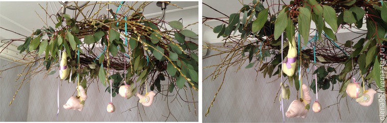 Привязываем к венку ленточки. Подвязываем венок к люстре, предварительно убедившись, что крепеж люстры выдержит дополнительный вес, примерно 3 кг.