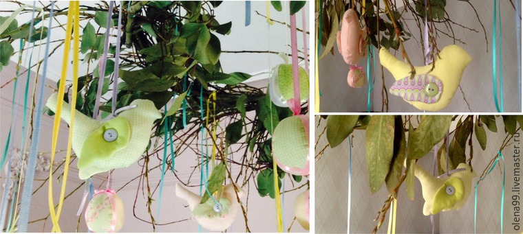 3. Нам понадобятся еще текстильные подвески и атласные ленточки разных цветов. зайчики, птички и пасхальные яйца.