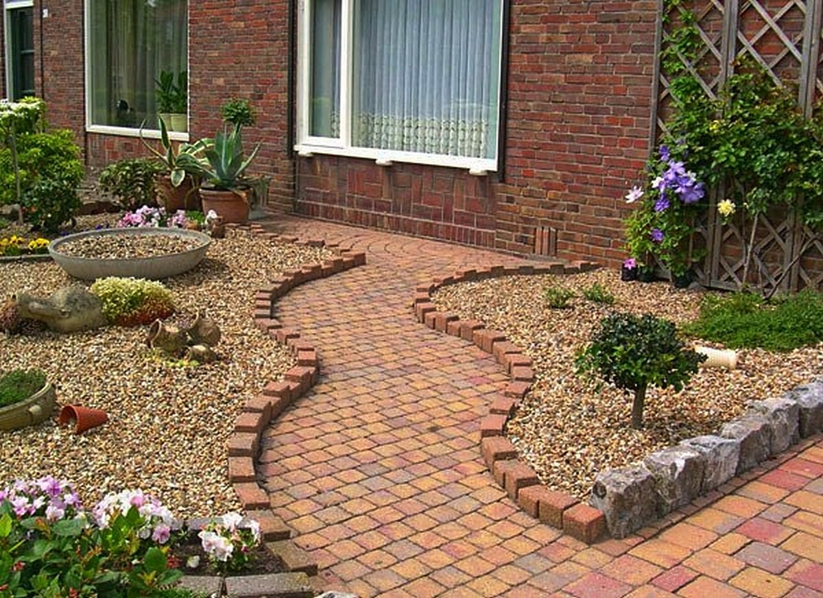 Разноцветный кирпич и клумбы с бордюрами из камней разной высоты создадут бесподобный ансамбль.