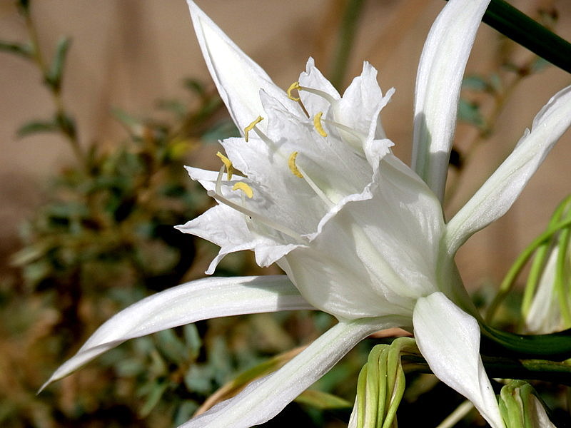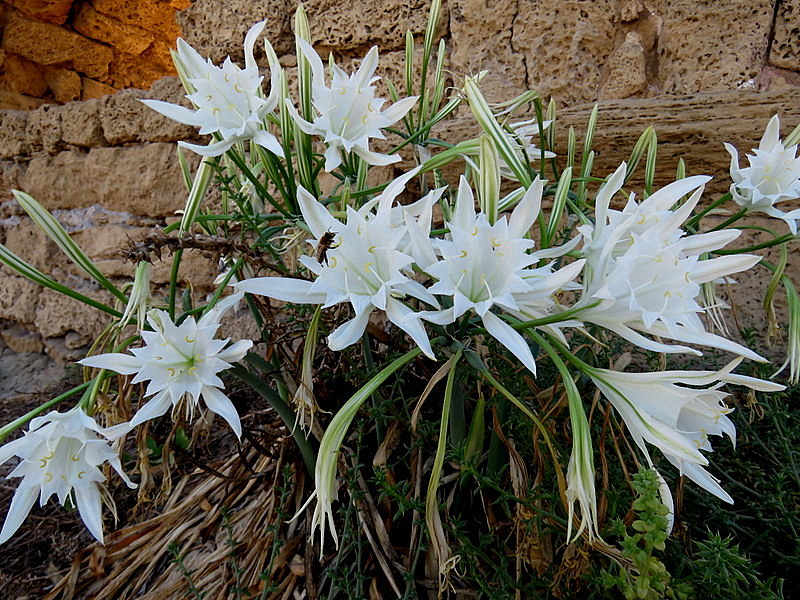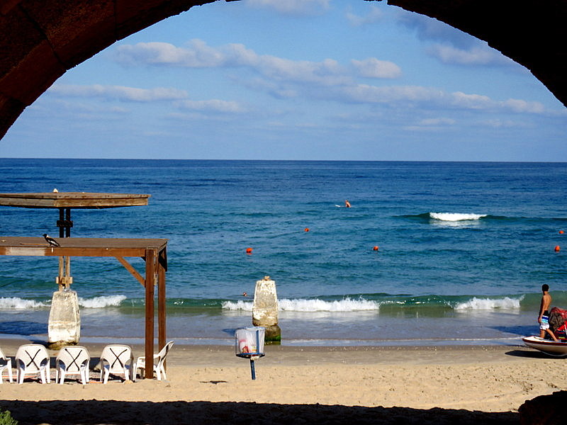 За аркой - пляж. Здесь нет "грибочков" и ресторанчиков, нет особых удобств для прихотливых людей. Впрочем: мелкий и чистый песок, удобное дно, деревянные тенты от солнца - что еще нужно отдыхающим, живущим поблизости? Что более ценно - пляж этот обустроен рядом с архаичной и монументальной конструкцией, которая интересна самой Истории. А сейчас, по осени, на побережье цветет панкраций...