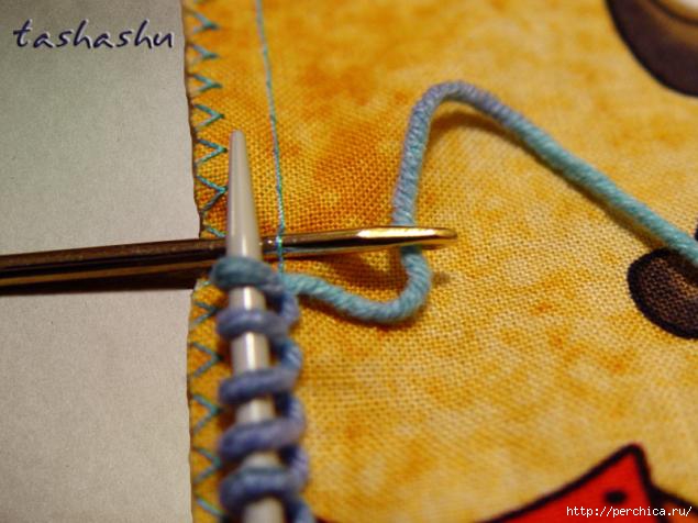 С помощью крючка с каждой стороны протягиваем петли и надеваем их на спицу ( с каждой стороны по 26 петель + 1 петля для уголка).