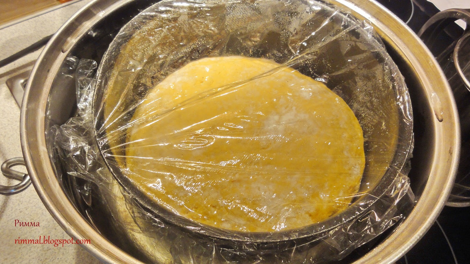 Затем тесто убираем в кастрюльку или глубокое блюдо, накрываем пленкой и убираем в теплое место на 2 часа. Тесто поднимется в 2-3 раза.