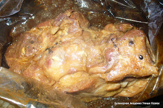 Итак, запеченную буженину извлеките из духовки, рукав аккуратно (не обожгитесь!) разрежьте