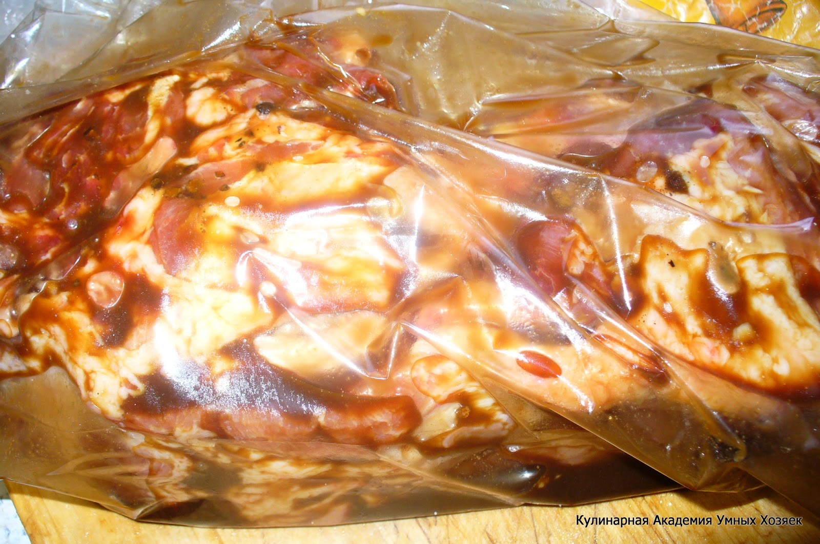 пакет завяжите и слегка помассируйте мясо, чтобы маринад равномерно по нему распределился.