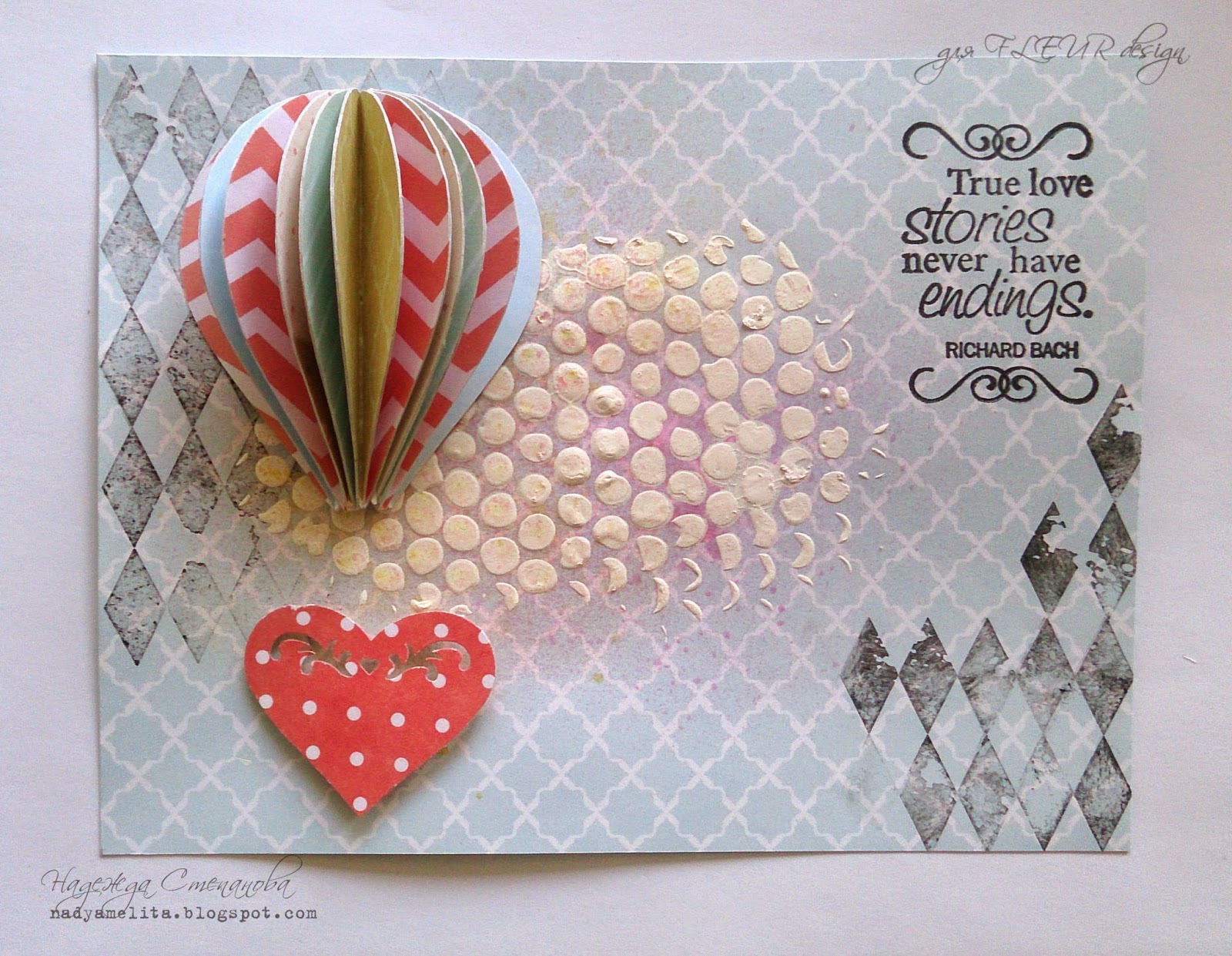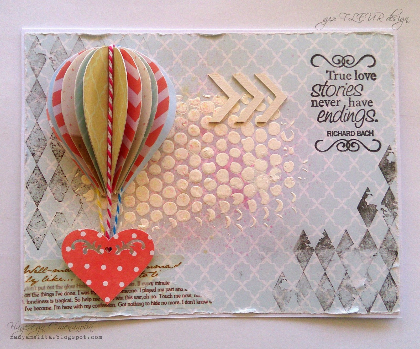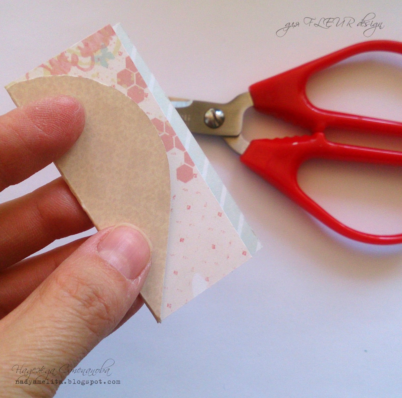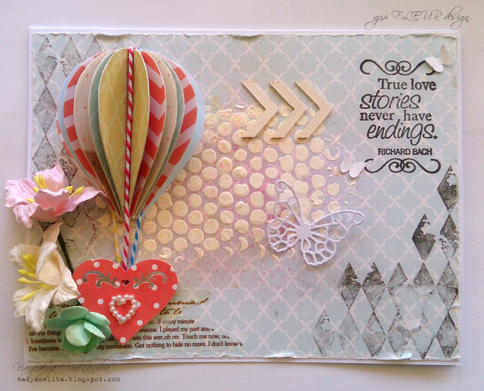 Для открытки я использовала обрезки из разных коллекций бумаги FLEUR design. Нарезала небольшие разноцветные заготовочки, из которых сделаю воздушный шар))).