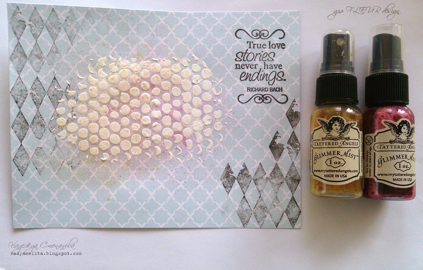 Теперь приступим к фону открытки. По нему я "прошлась"))) фоновым штампом, а также при помощи трафарета и текстурной пасты нанесла дополнительный фон.