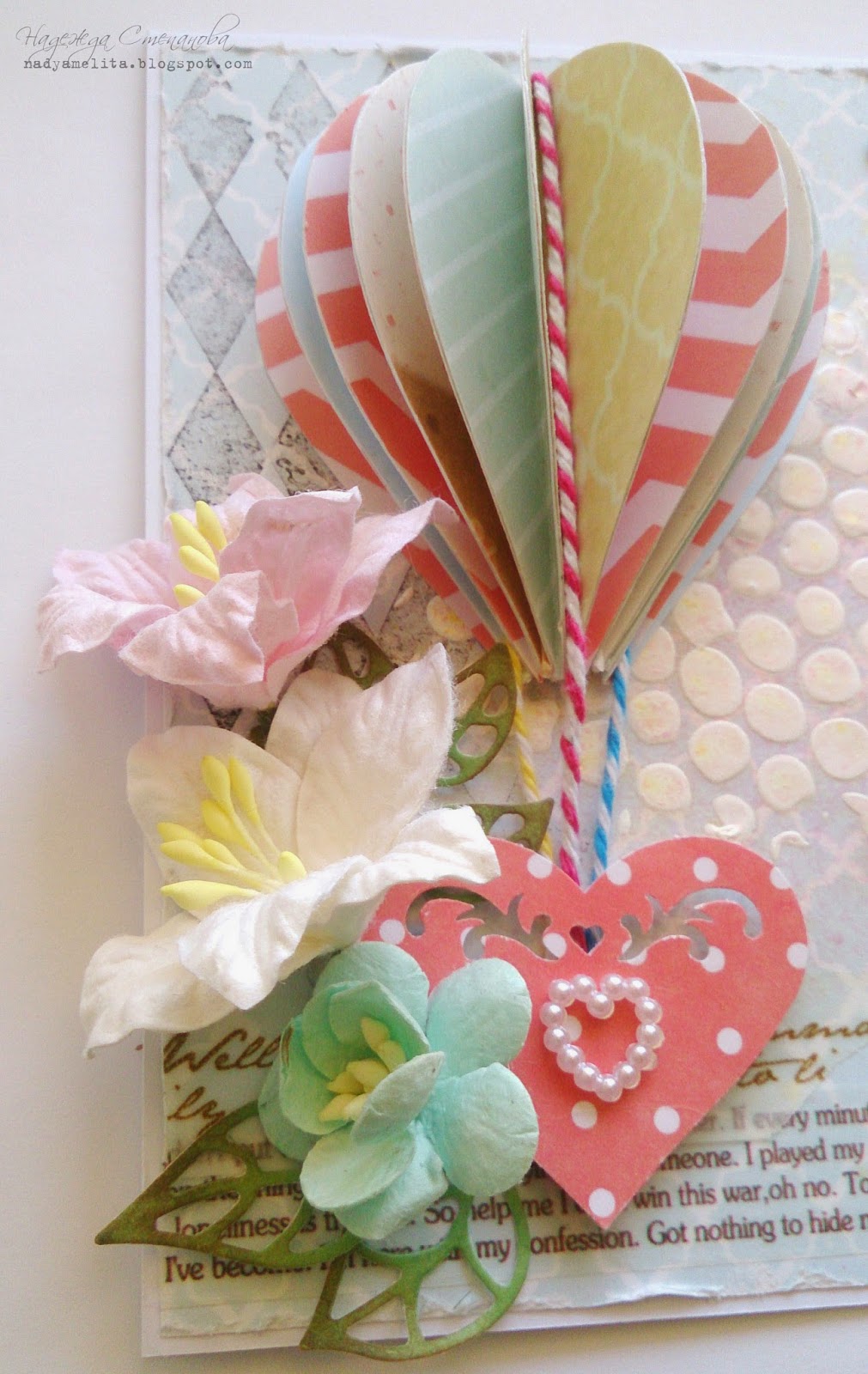 Теперь приклеиваю наш шар к фону открытки, бечёвки склеиваю в центре сердца.