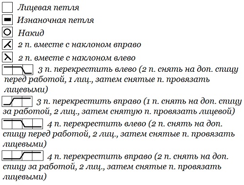 9 ряд: 1 кром., 1 накид, 2 п. вместе с наклоном влево, 2 изн., 4 п. перекрестить влево, 9 лиц., 4 п. перекрестить вправо, 2 изн., 2 п. вместе с наклоном вправо, 1 накид, 1 изн., 1 кром.