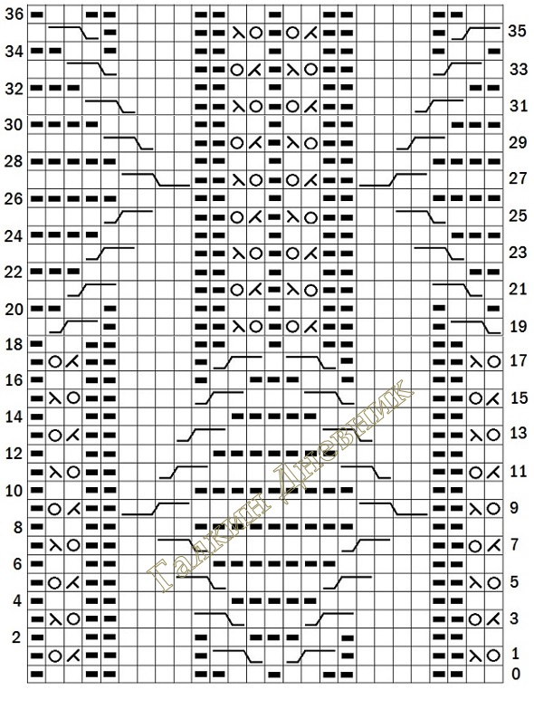 36 ряд: 1 кром., 1 лиц., 2 изн., 2 лиц., 4 изн., 2 лиц., 2 изн., 1 лиц., 2 изн., 2 лиц., 4 изн., 2 лиц., 2 изн., 1 кром.