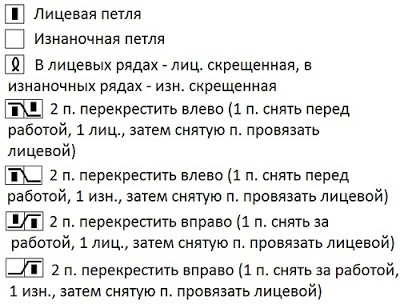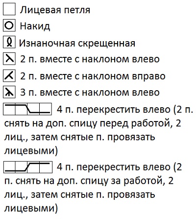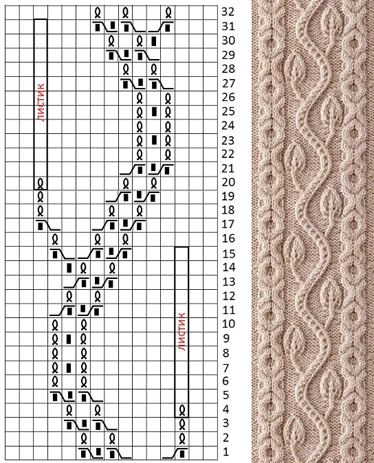 25 ряд: 1 кром., 4 п. перекрестить влево, 4 п. перекрестить вправо, 3 изн., 1 лиц/скр., 1 лиц., 1 лиц/скр., 6 изн., (2 лиц., 1 накид, 1 лиц., 1 накид, 2 лиц. - листик), 2 изн., 4 п. перекрестить влево, 4 п. перекрестить вправо, 1 кром.
