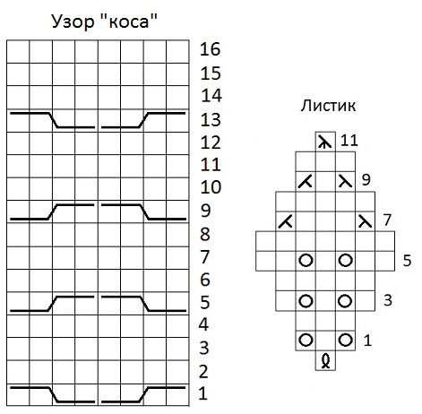 11 ряд: 1 кром., 8 лиц., 2 изн., (2 п. вместе с наклоном влево, 3 лиц., 2 п. вместе с наклоном вправо - листик), 5 изн., 2 п. перекрестить вправо, 2 п. перекрестить вправо, 3 изн., 8 лиц., 1 кром.