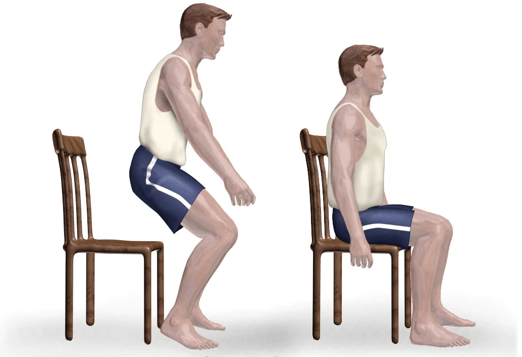 Чем ниже таз находится над стулом, и чем дольше удерживаем фиксацию, тем лучше. Постепенно научиться удерживать изометрическое напряжение в течение 1 минуты.