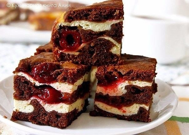 Перемешиваем миксером. Добавляем разрыхлитель. И муку. Перемешиваем миксером, на самой низкой скорости (я перемешала лопаткой). В форму с высокими бортиками (21 см.), смазанную сливочным маслом, выливаем 1/3 теста. Распределяем по форме. Выкладываем половину творожной массы. На массу, размороженную вишню. Половину от всего количества. Далее: тесто, творожная масса, вишня, тесто. Тесто стараться распределить равномерно, где-то это может не получаться, это не страшно. По верхнему слою, можно сделать разводы. Выпекаем 40-50 минут, в разогретой до 180 градусов духовке. Остужаем в форме. Затем освобождаем от формы, режим на кусочки и наслаждаемся!