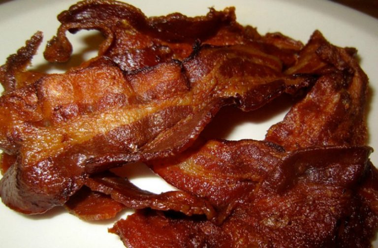 Выстелите тарелку бумажным полотенцем, сверху разложите ломтики бекона в 1 слой, прикройте вторым бумажным полотенцем и поставьте в печь. Время приготовления зависит от толщины ломтиков.