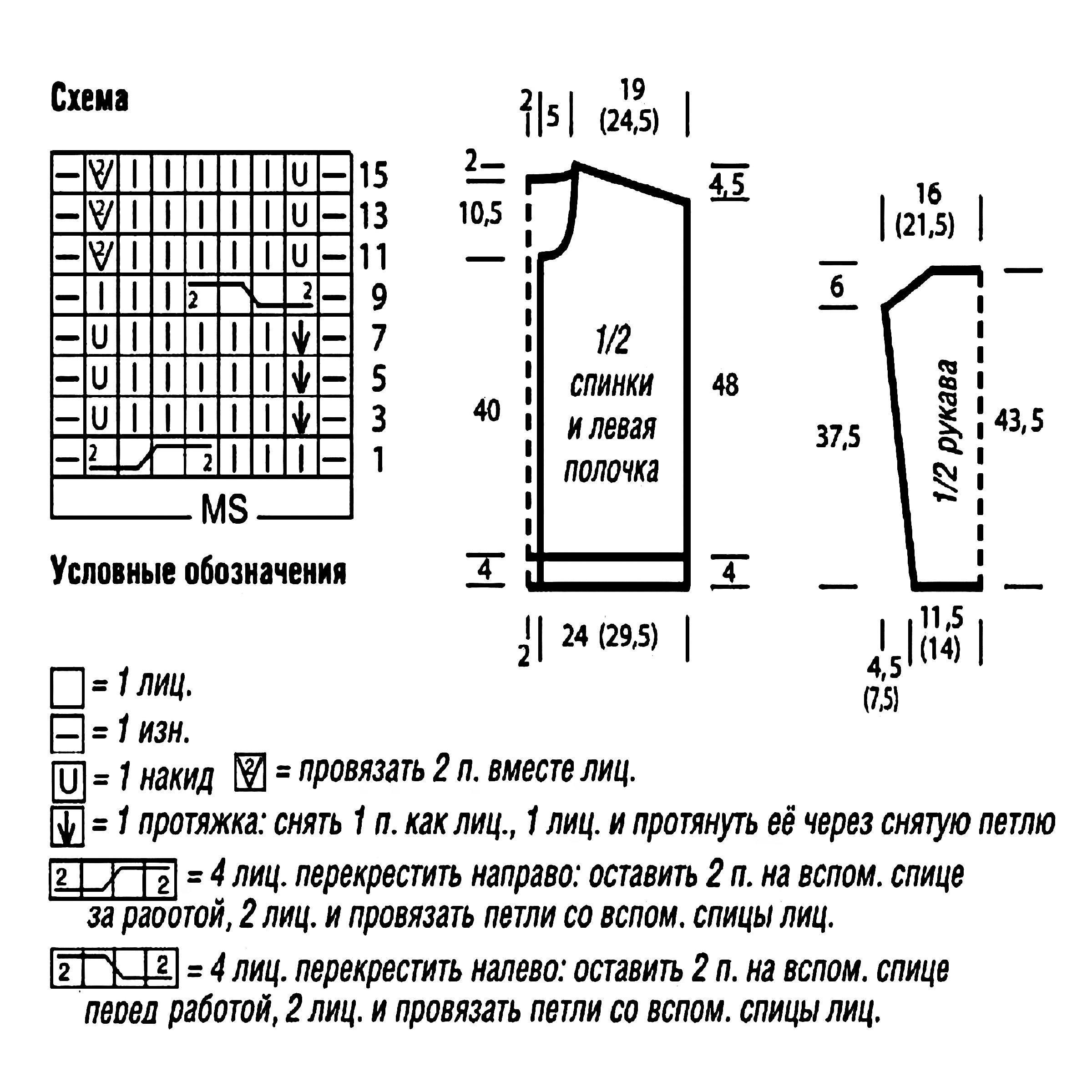 Резинка: число петель кратно 4 + 2 кром. Каждый ряд начинать и заканчивать 1 кром. Лиц. р.: * 1 лиц., 2 изн., 1 лиц., повторять от *. Изн. р.: петли вязать по рисунку.