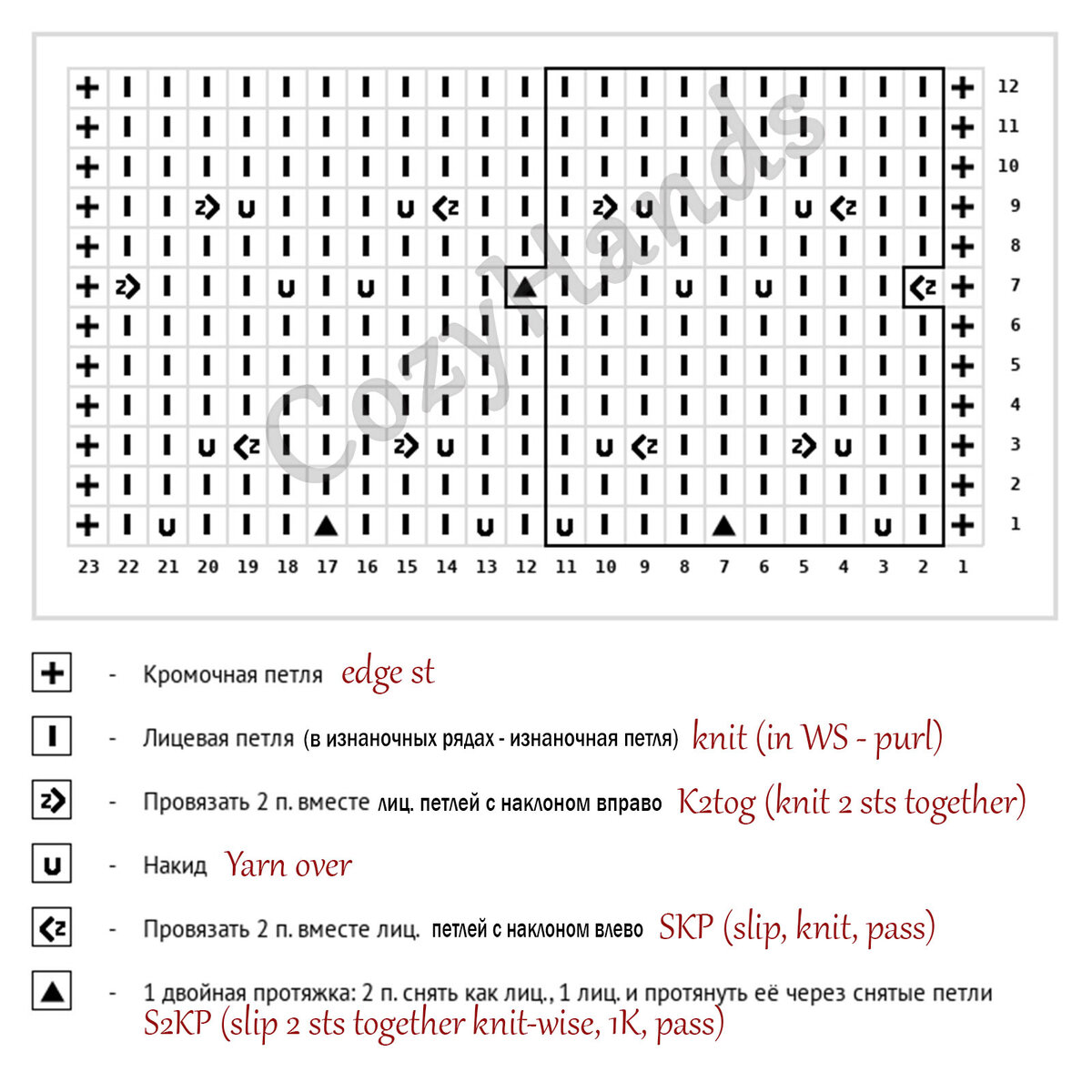 Раппорт узора состоит из 10 петель и 12 рядов.