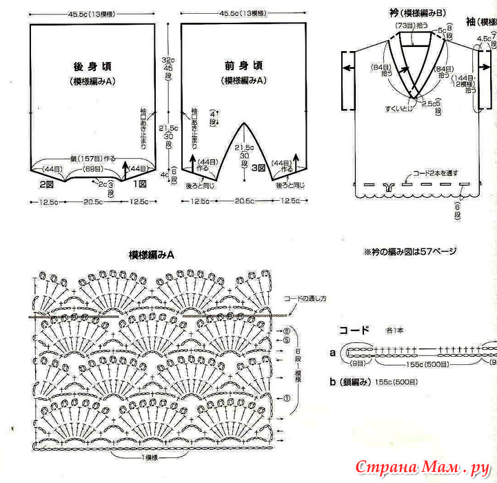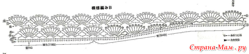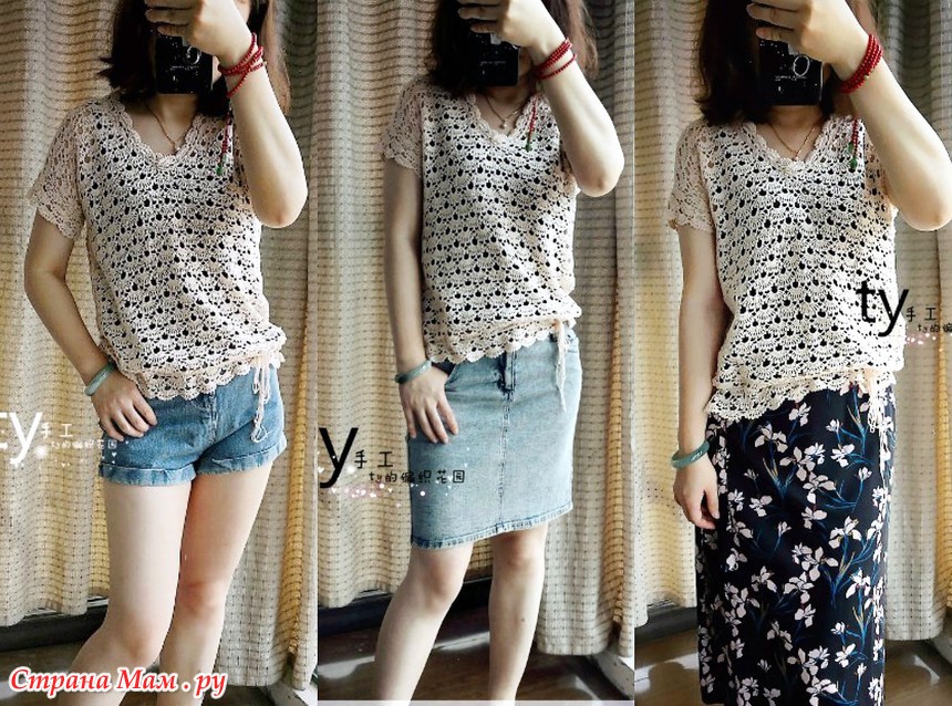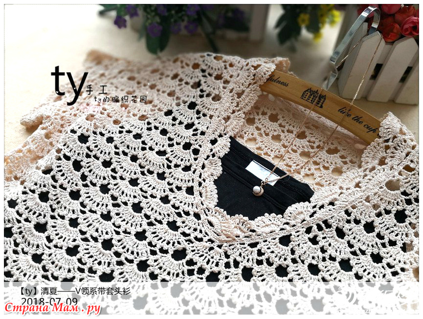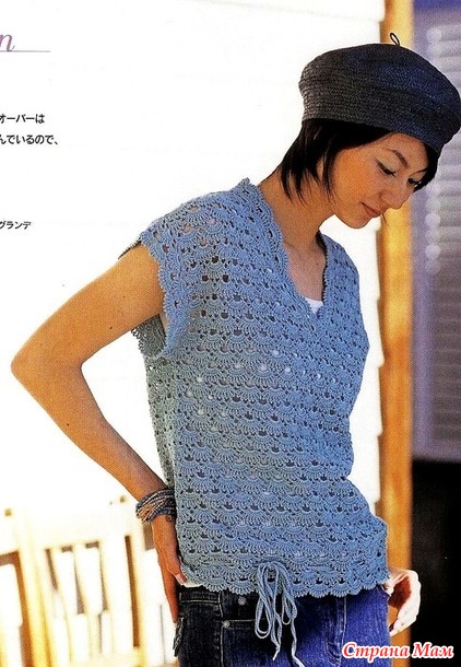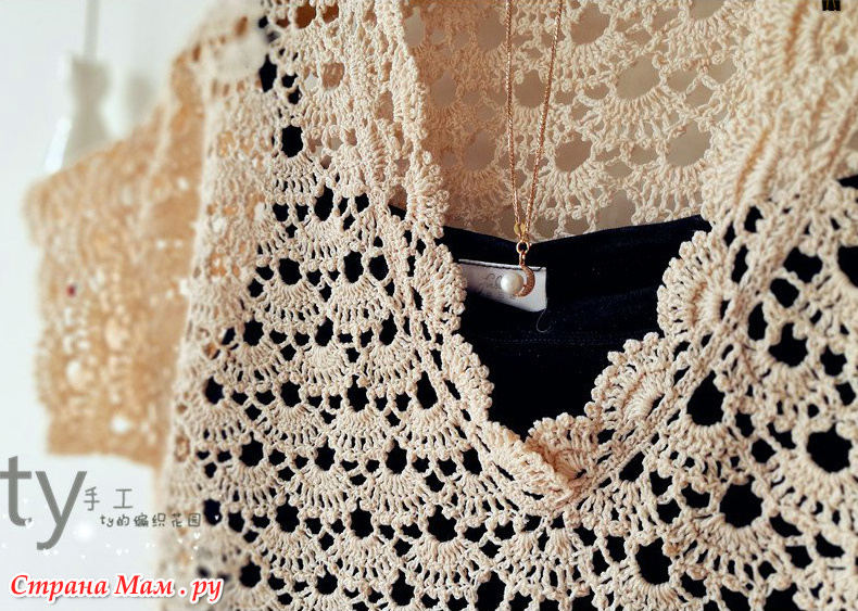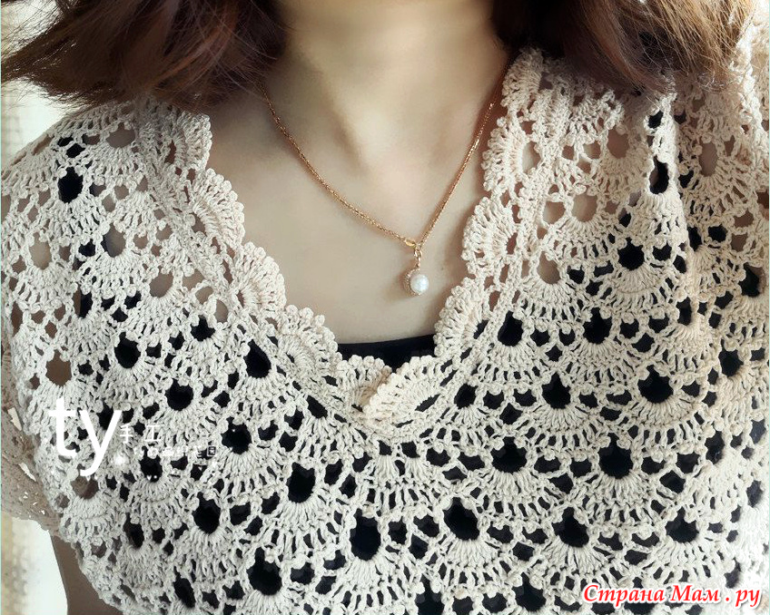 Этот летний ажурный пуловер с короткими рукавами большим треугольным вырезом и оборкой не пояске выполнена нежным веерным узором.Она смотрится по моложежному непринужденно и очень комфортно .