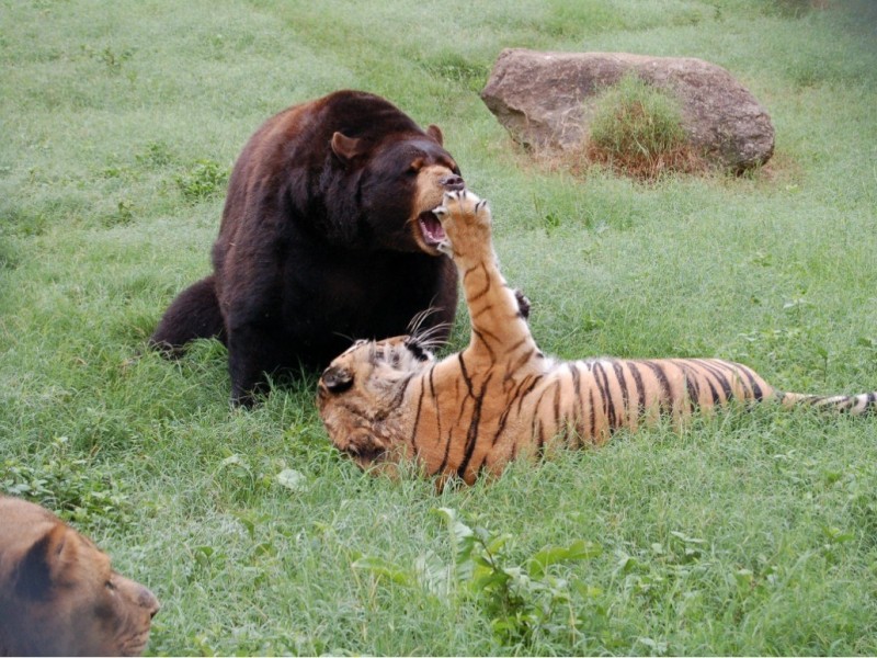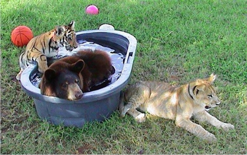 Сейчас они живут в вольере в 1,01 гектара, через который протекает природный ручеек. У них даже есть свой «сельский домик», где лохматое трио любит коротать время. На сегодняшний день это единственный известный случай, когда три крупных «высших» хищника разных видов живут так близко друг к другу и так дружно. Все трое самцы и примерно одного возраста.