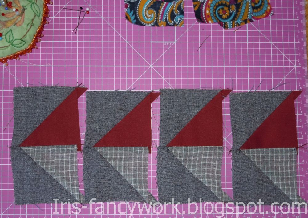 Пришить к темно-коричневым треугольникам серые фоновые треугольники по одному из катетов