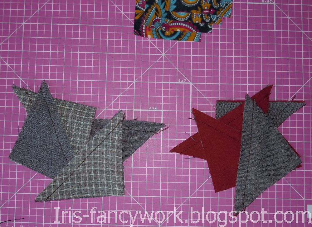 Сшиваем по диагонали светло-серые и бордовые треугольники с серыми “фоновыми” треугольниками.
