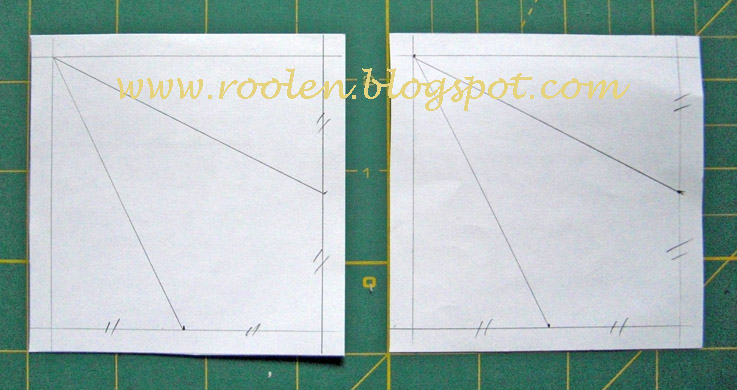 Поэтому для начала нарисовала на бумаге два квадрата в натуральную величину со стороной 3.5 дюйма. Затем начертила припуск 1/4", наметила середины двух сторон и соединила их с противоположным углом - см.фото: