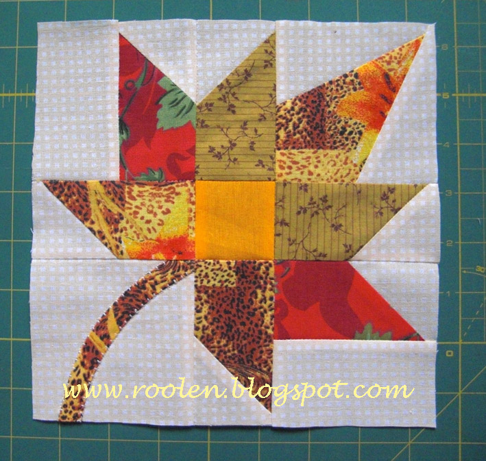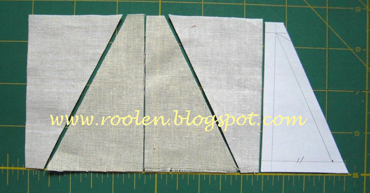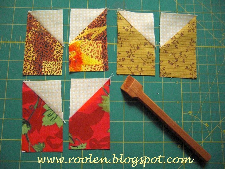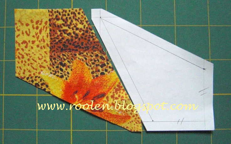 Напомню - для одного листа потребуется два треугольника из фоновой ткани в зеркальном отображении и один ромб из цветной ткани.