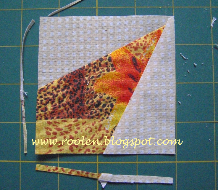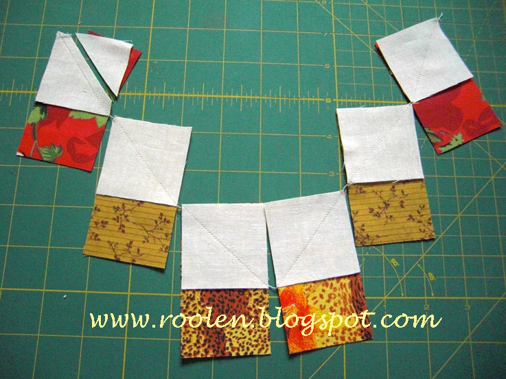 На маленьких светлых квадратах нарисовать диагональ и пристрочить на цветные прямоугольники. Три в одну сторону, три - в другую: