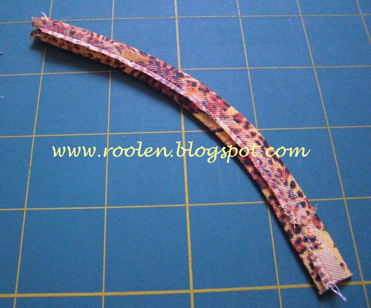 Полоску цветной ткани сложить вдоль лицевой стороной вверх и прострочить на 2=3 мм от края. Разутюжить и сразу придать утюгом изогнутую форму: