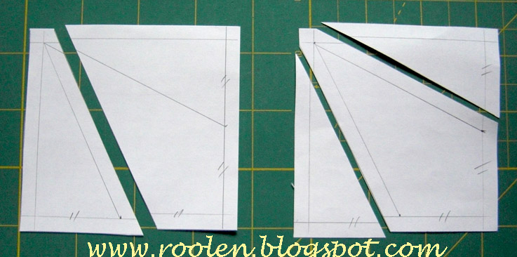 Далее из одного квадрата вырезала треугольник с припуском, из второго - середину с припуском. Вот этими шаблонами и буду пользоваться для раскроя.