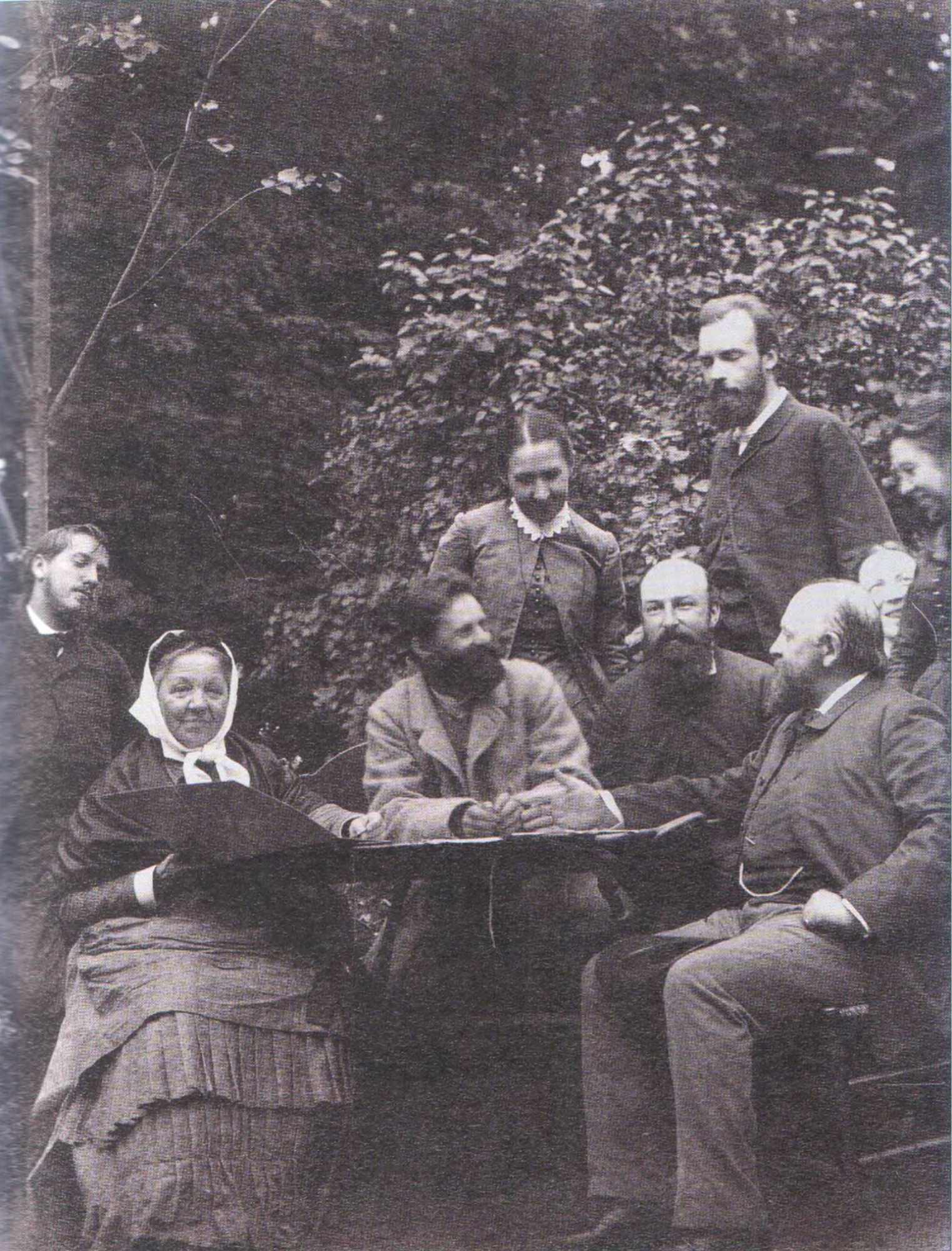 Гости и хозяева имения Абрамцево. 1880-е. Слева направо: Валентин Серов, мать Поленова Мария Алексеевна,скульптор Марк Антокольский, Елизавета Мамонтова, друг семьи доктор Спиро, художник Илья Остроухов (стоит во втором ряду), Савва Мамонтов, Елена Поленова, Наталья Якунчикова.