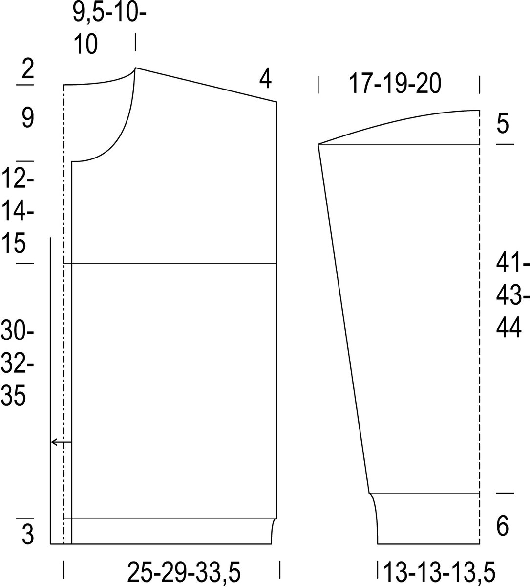 Когда высота рукава составит 47 (49) 50 см, в каждом втором ряду закрыть петли с обеих сторон: 0 (2) 2 x 6 п., 2 (0) 2 x 5 п., 2 (3) 1 x 4 п. и 4 (3) 3 x 3 п. Закройте оставшиеся петли.