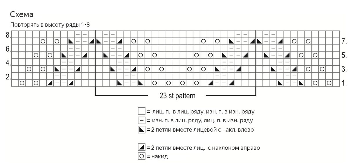 Раппорт узора = 23 петли и 8 рядов. На схеме указаны и лицевые, и изнаночные ряды.