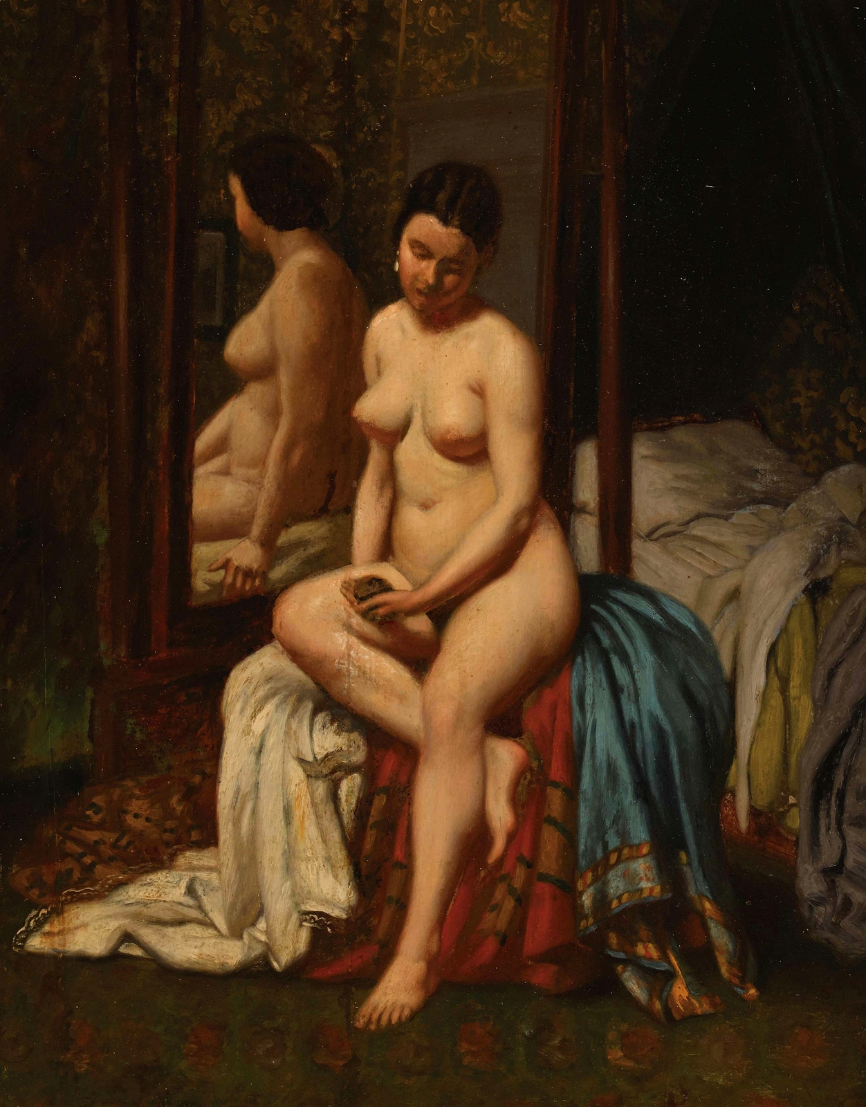 Французская школа (French School), XIX век_Интерьер с сидящей обнаженной