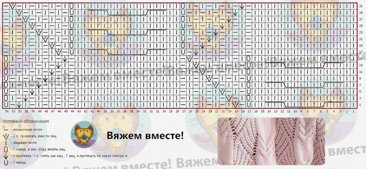 Раппорт составляет 54 петли и 32 ряда. В оригинале деталь переда содержит три полных раппорта плюс 16 дополнительных петель.