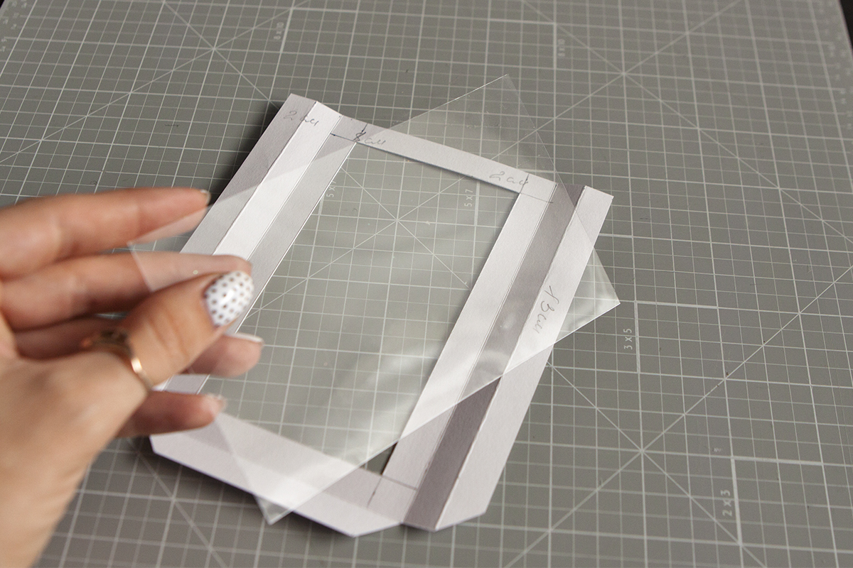 7. Делаю окошко прозрачным. Беру прозрачную пленку, плотную! В кармане отступила по 1 см с каждой стороны. Пленку вырезала размером с карман 8 на 13 см.