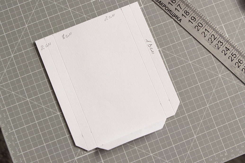 3. Сделаю еще одну створку. По высоте она меньше на 2 см, по ширине на 3 см. Делаю прорезь: отступаю от линии сгиба 1 см, сверху и снизу 1 см. Не забываю что у второй створки 1 см на загиб!!! Поэтому створку №2 делаем на 1 см по ширине больше.