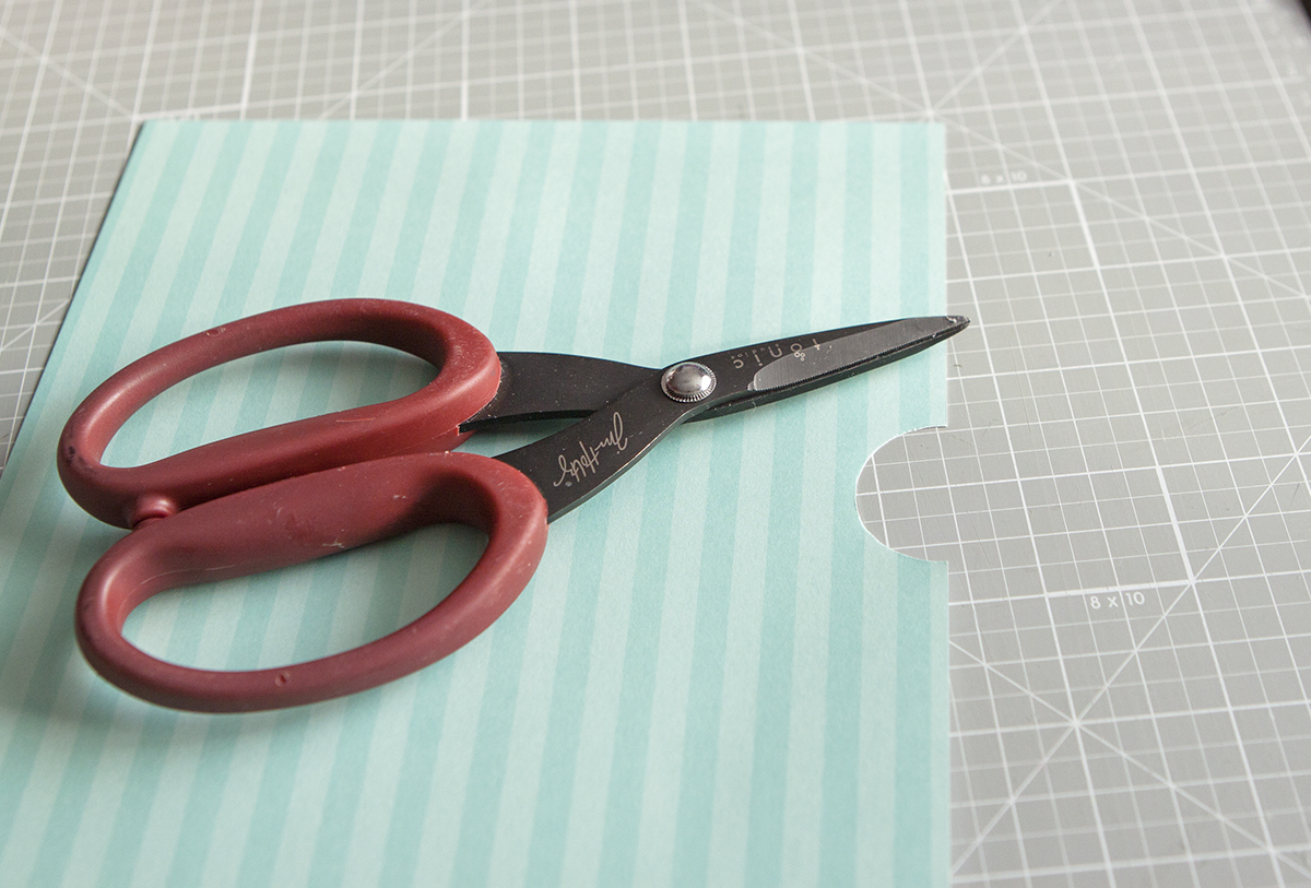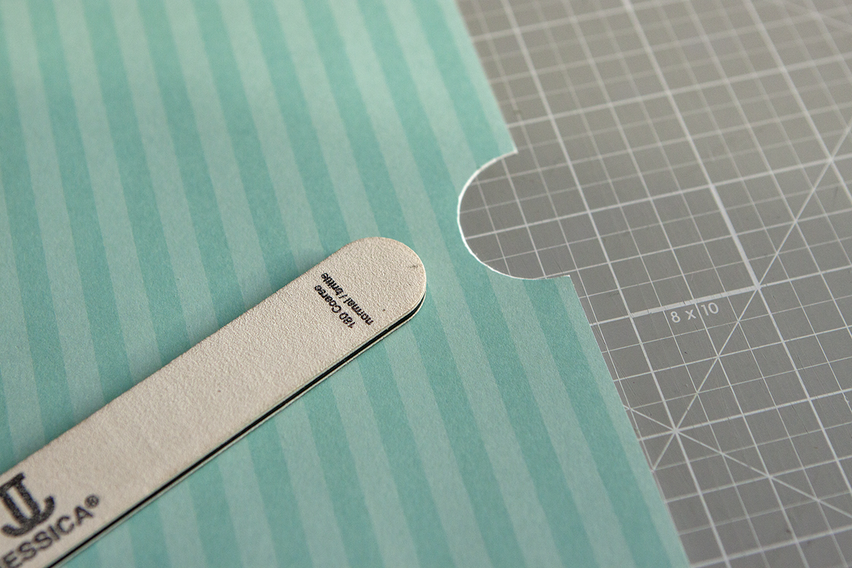1. Делаю большой карман. Для удобства использования делаю полукруг с одной стороны. Если нет у вас машинки для вырубки и тиснения, то купите себе вот такую чудесную линейку!