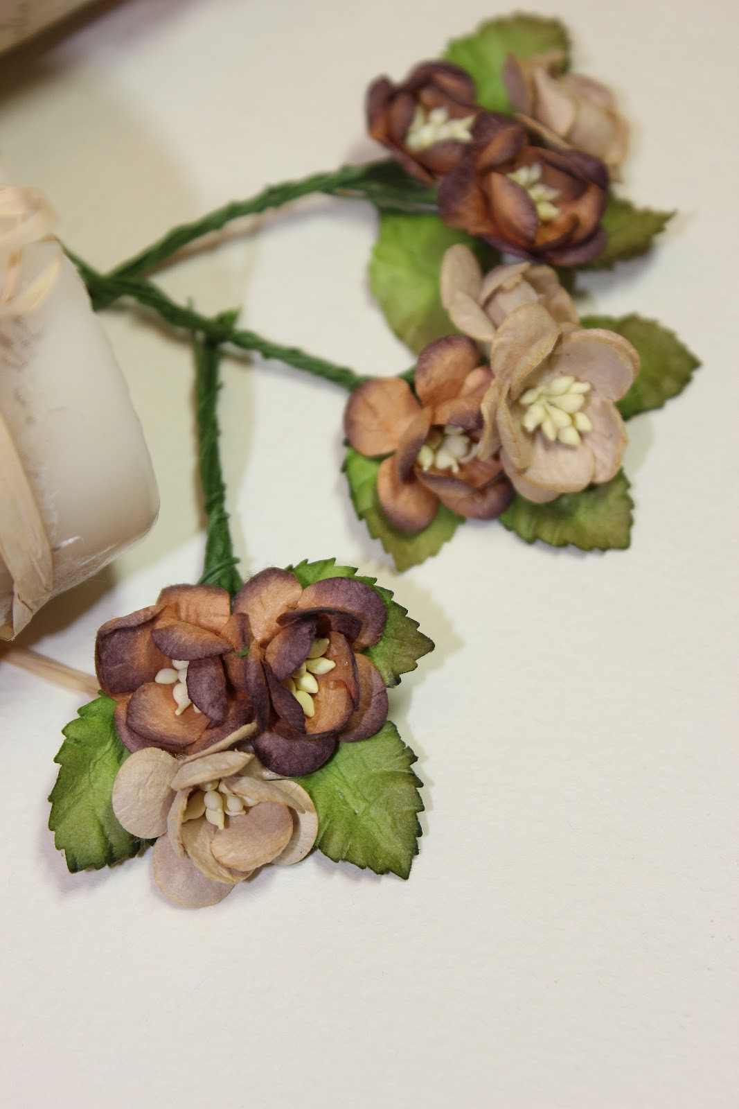 Свечи готовы, но хочется конечно их украсить! Я взяла скрап цветочки (одной гаммы) и лепесточки, обьеденила их в букетики