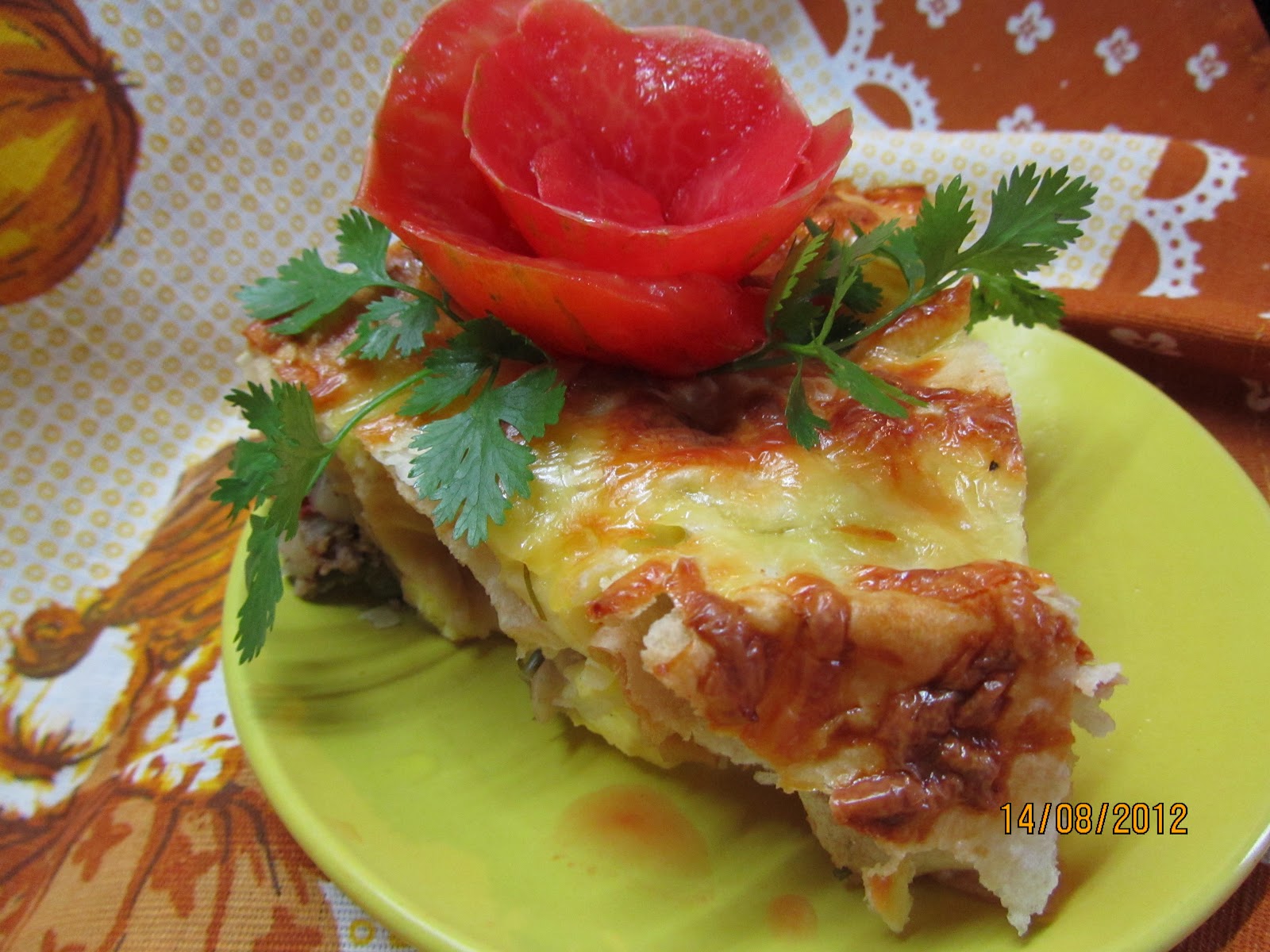 Готовим заливку: смешать сметану, яйца и тертый на крупной тёрке сыр. Заливаем пирог, стараясь заполнить все промежутки между рулетами и отправляем в разогретую до 200 градусов духовку. Готовим до румяной корочки, примерно 30-35 минут. Всем приятного аппетита.