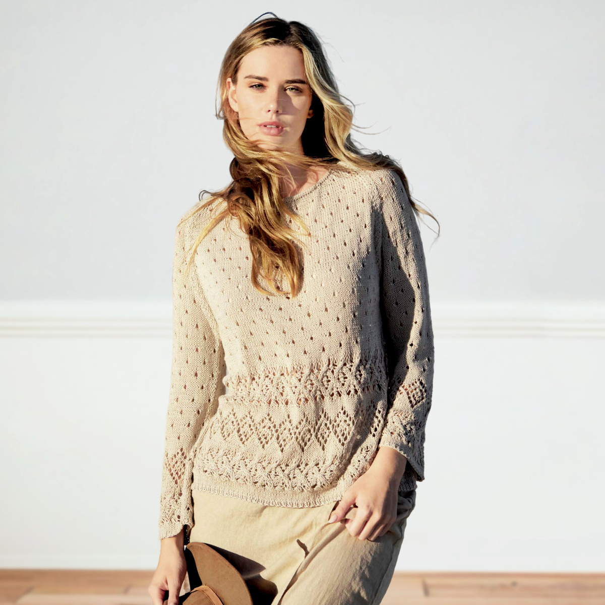 Для вязания нам потребуется 350 (400) 450 г светло-бежевой пряжи: 100% хлопок; 170 м/50 г. Спицы № 3 и 3,5. А также круговые спицы № 3.