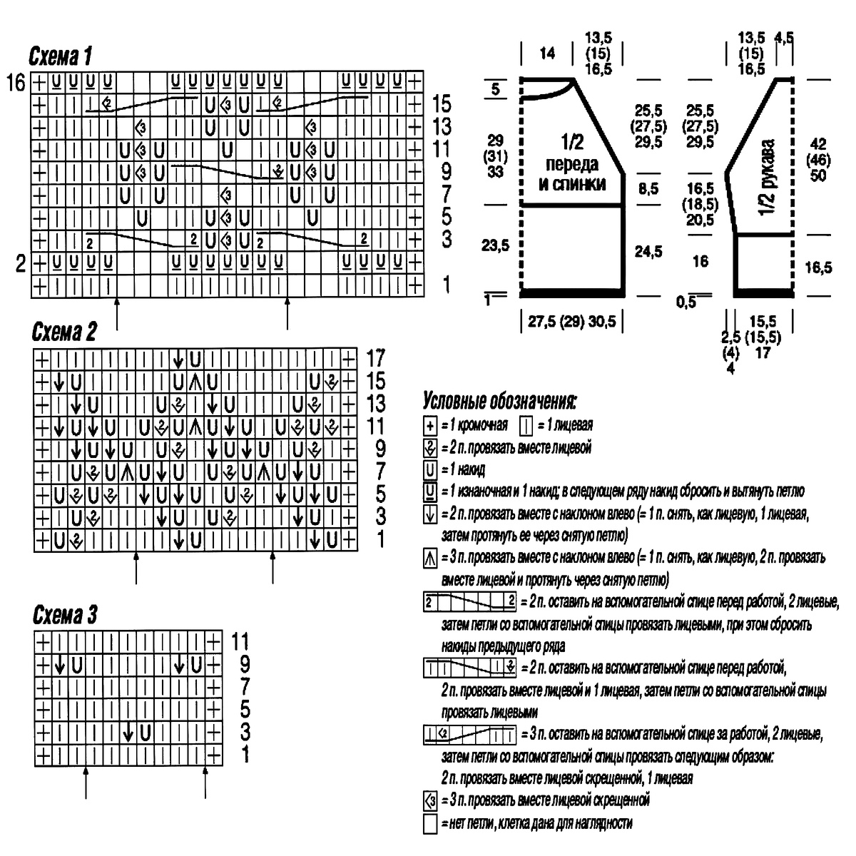 Узор 3: ажурный узор из «кос» (число петель кратно 7 + 1 + 2 кромочные) = вязать согласно схеме 1. На ней даны лицевые и некоторые изнаночные ряды; в неприведенных изнаночных рядах все петли и накиды провязывать изнаночными. Начать с петель перед правой стрелкой, постоянно повторять раппорт из 7 п. между стрелками и закончить петлями после левой стрелки.