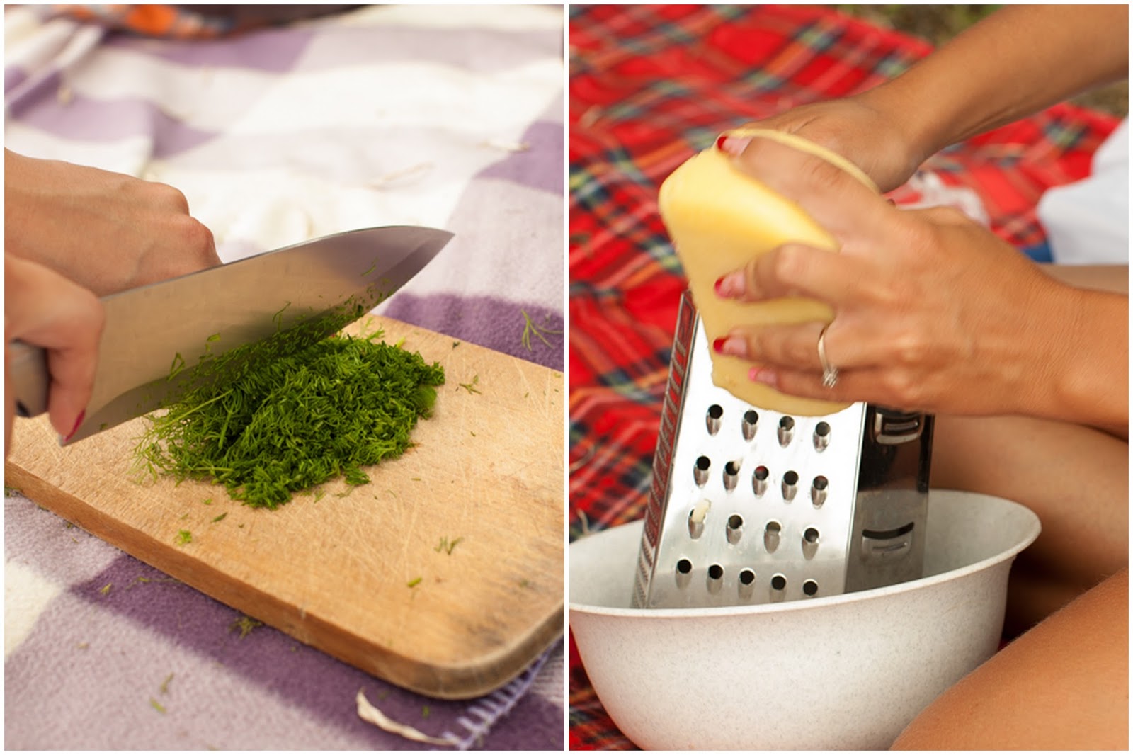 В первую очередь, натираем сыр на крупную терку. Так как на природе рук обычно много, параллельно с этим мелко режем укроп.