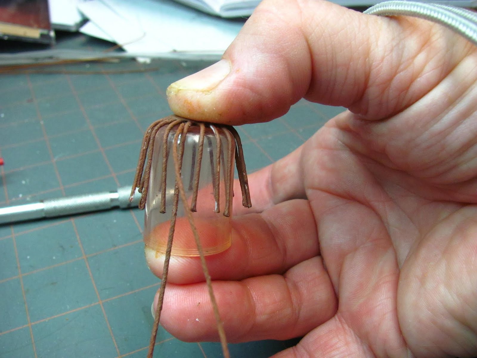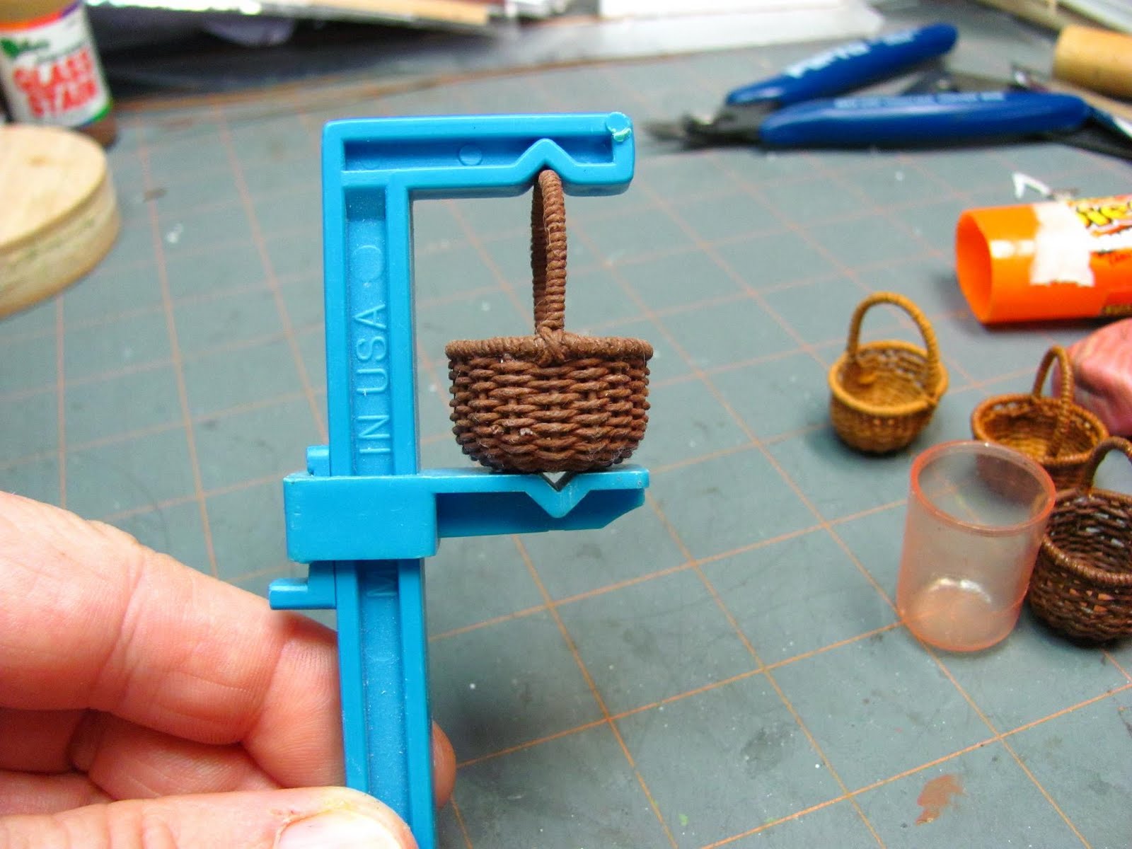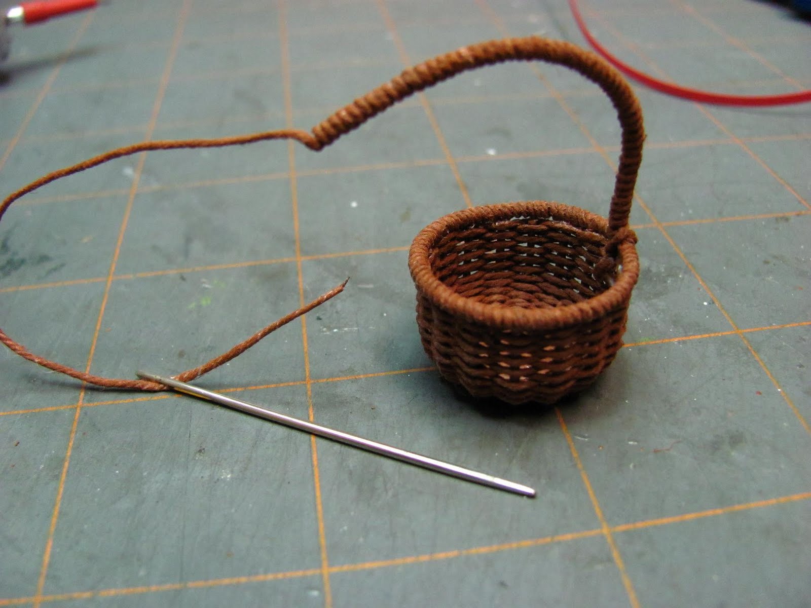 Этот учебник появился, когда я спросил о потоке я использовал, когда я сделал лейки. Это нить вязания крючком, пальто и Кларк, Classic. Миниатюрист хотел плести корзины с ним.