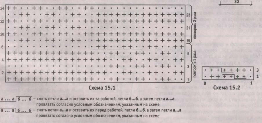 Рукав: на спицы №2,5 набрать 42 п. и связать 4 ряда резинкой, в последнем изнаночном ряду вязать лицевыми петлями и прибавить 6 п. (- 48 п.). Продолжить спицами №4 и распределить петли в следующем порядке: кром., *19 п. узором по схеме 15.1 (начать с 10-й петли, 8 п. узором по схеме 15.2,19 п. узором по схеме 15.1 (начать с 1-й петли), кром. Для расширения прибавить с обеих сторон по 1 п. 13 раз в каждом 4-м ряду и 10 раз в каждом б-м ряду (- 94 п.). Новые петли включать в узор по схеме 15.1. На высоте 57 см от начала закрыть с обеих сторон в каждом 2-м ряду 3 раза по 1 п., 1 раз по 2 п., 1 раз по 3 п. и 1 раз оставшиеся 78 п. Второй рукав вязать аналогично.