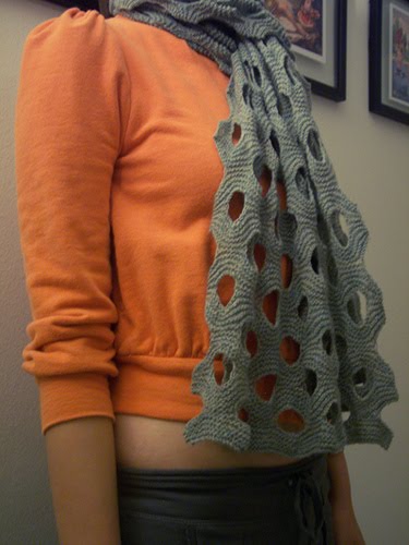 Ажурный шарф связан спицами узором со сброшенными накидами, благодаря которому он выглядит «дырчатым».