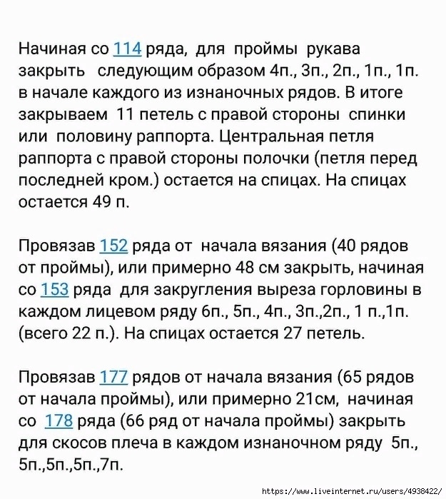 Провязав 176 рядов от начала вязания (64 ряда от начала проймы), или примерно 21см, начиная со 177 ряда (65 ряда от начала проймы) закрыть для скосов плеча в каждом лицевом ряду: 5п.,5п.,5п.,5п.,7п.