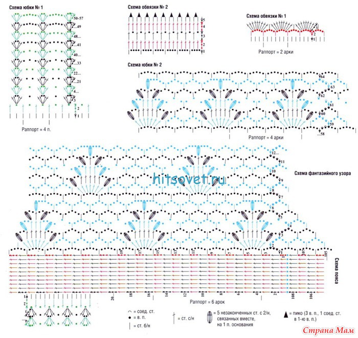 Крючком: соединительные столбики (соед. ст.), воздушные петли (в. п.), столбики без накида (ст. б/н), столбики с накидами (ст. с/н); фантазийный узор: вязать согласно схеме; схема юбки: вязать согласно схемам № 1 и № 2; обвязка: вязать согласно схемам № 1 и № 2.